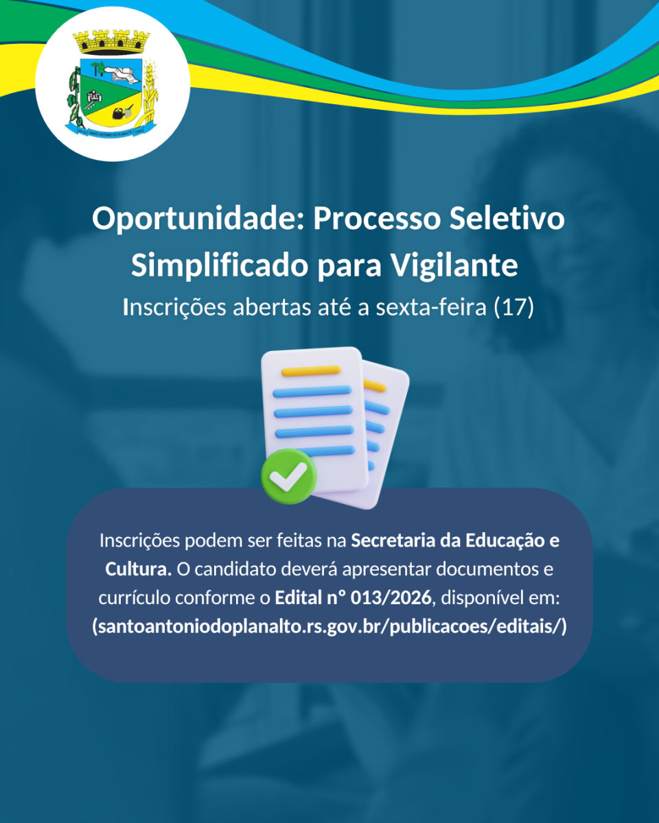 As inscrições estarão abertas até a sexta-feira, dia 17 de abril, e podem ser feitas na Secretaria da Educação e Cultura. O candidato deverá apresentar documentos e currículo conforme o Edital nº 013/2026, disponível em: (santoantoniodoplanalto.rs.gov.br/publicacoes/editais/).