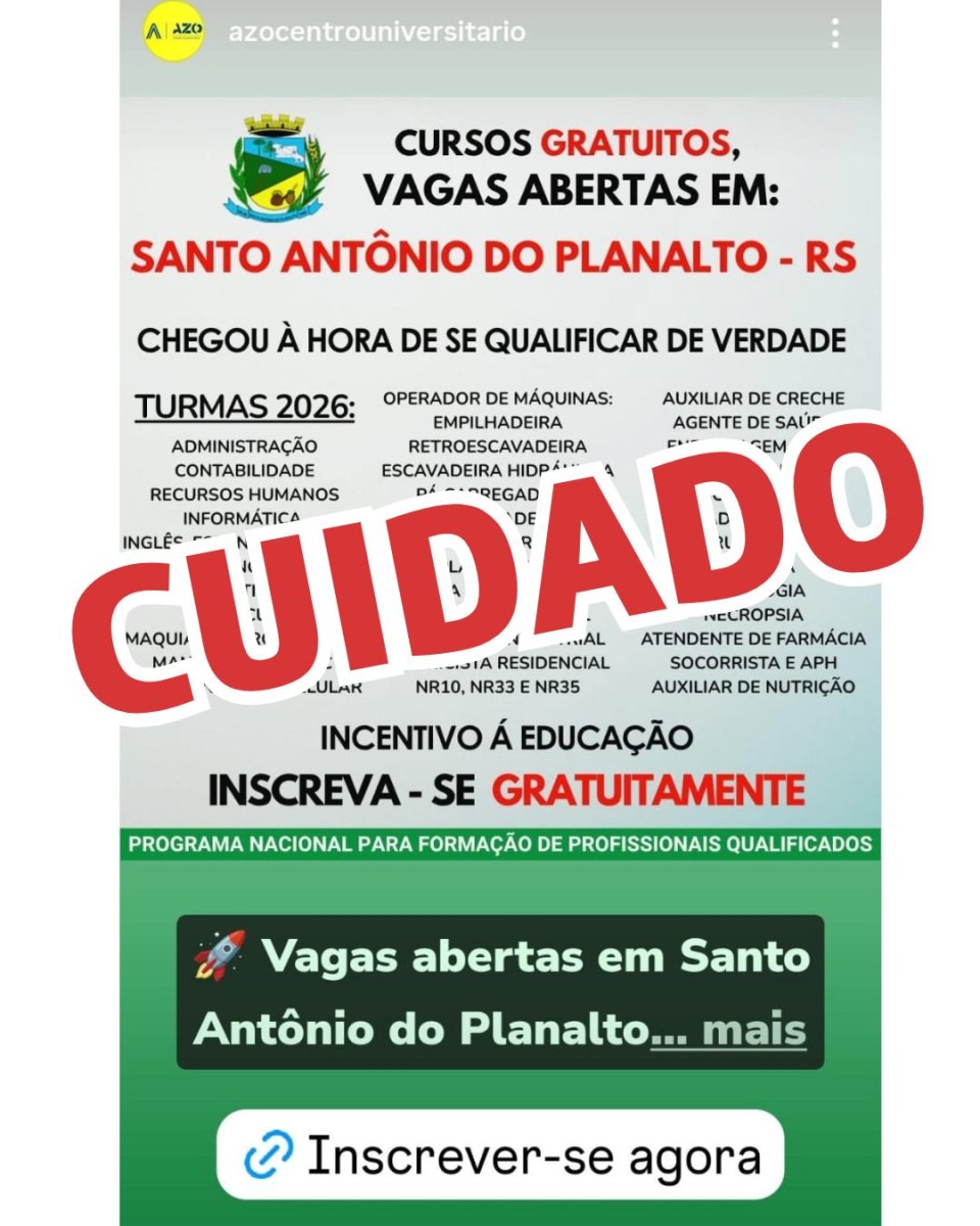 A Prefeitura de Santo Antônio do Planalto informa que não possui conhecimento nem vínculo com a oferta de cursos divulgada recentemente nas redes sociais, conforme imagem em circulação.